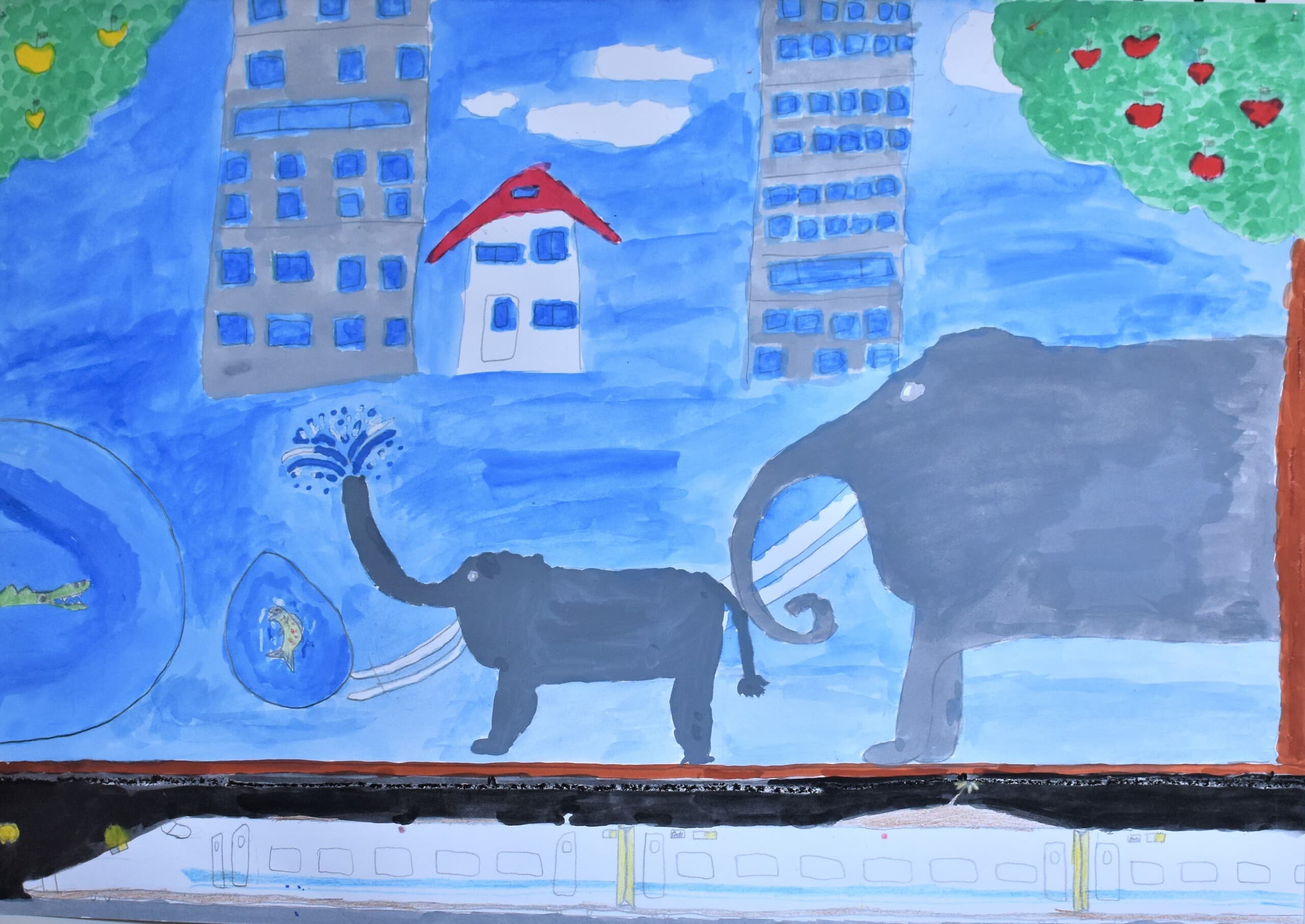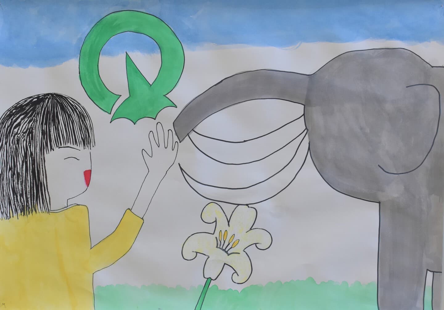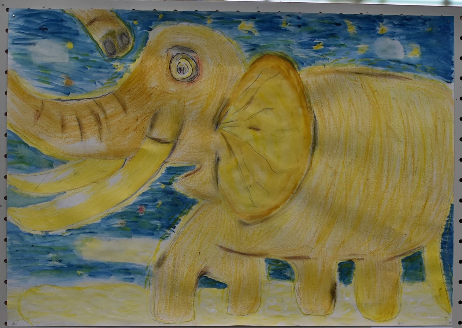 生きていたゾウをイメージしてクレヨンと絵の具を合わせて空も地面もいい色を絵の具で作って書いたのでそこを見てほしいです。ゾウの水の再現をクレヨンの線を指でこすって絵の具で塗ったところも見てほしいです。