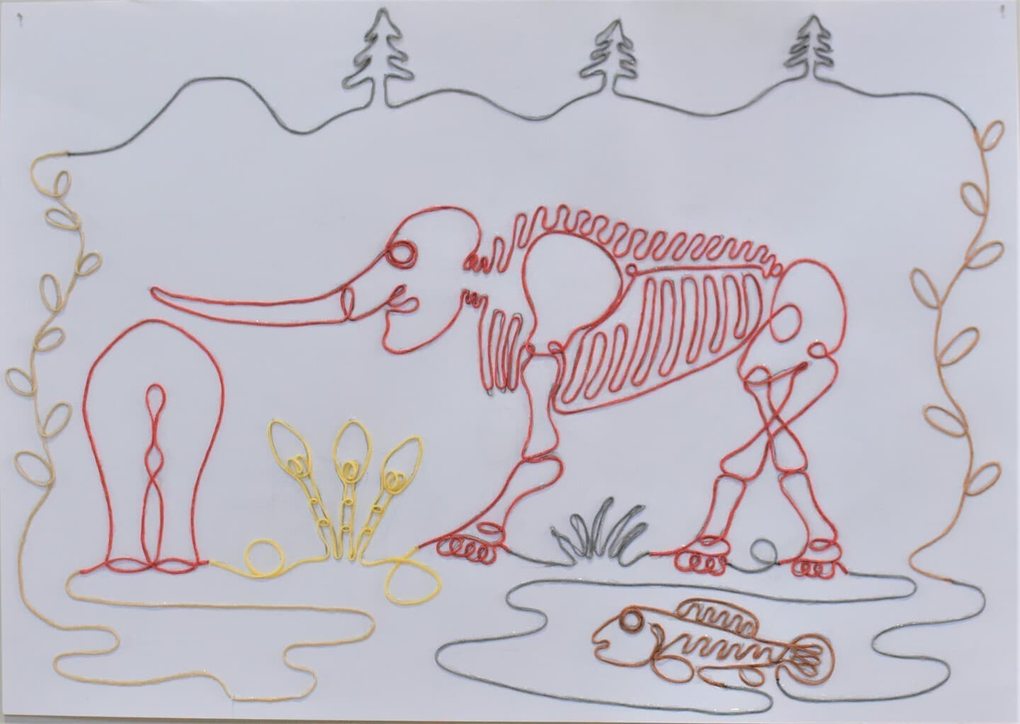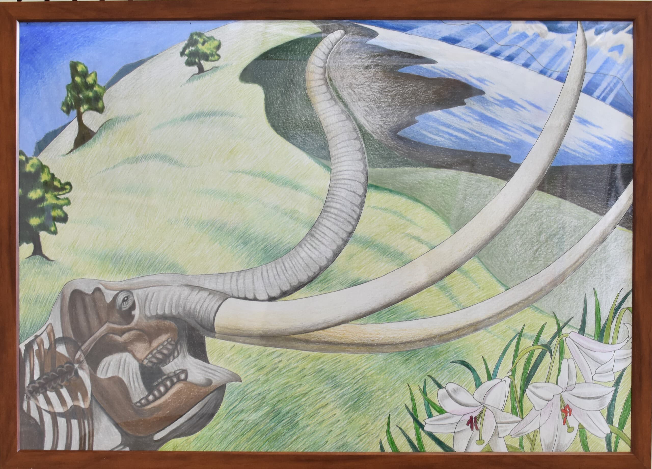 約180万年前に生きていたアケボノゾウと今化石となってこの令和の時代を生きているアケボノゾウ、何100万年ものときがたって、今このアケボノゾウは姿を変えてこの時代に現れているという意味を込めました。見て欲しいところは地層と絵の中の世界線です。とくに地層は色を重ねて書いたのでそこに注目してほしいです。