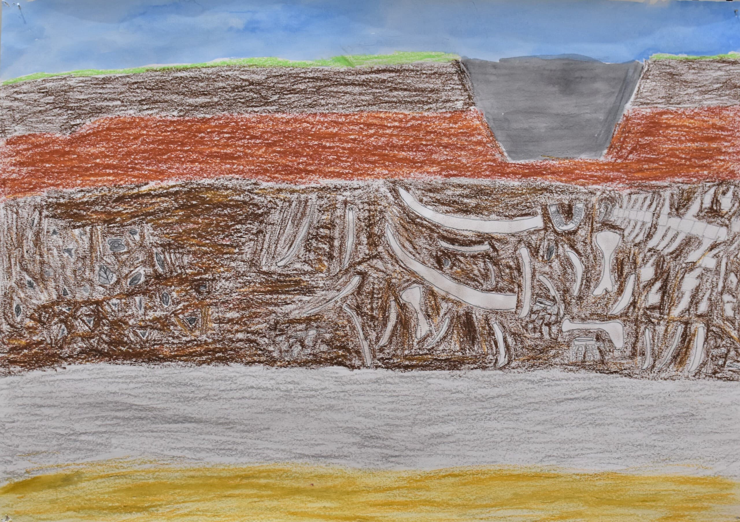アケボノゾウを初めて見て大きいなと思ったので骨で書いてアケボノゾウを大きく強調して描きました。クレヨンで骨の下の土をぼかして下にあるように見えるようにしました。周りにある土は丸形で地層みたいにして上と横を端っこまで書いて、続きがあるようにしました。