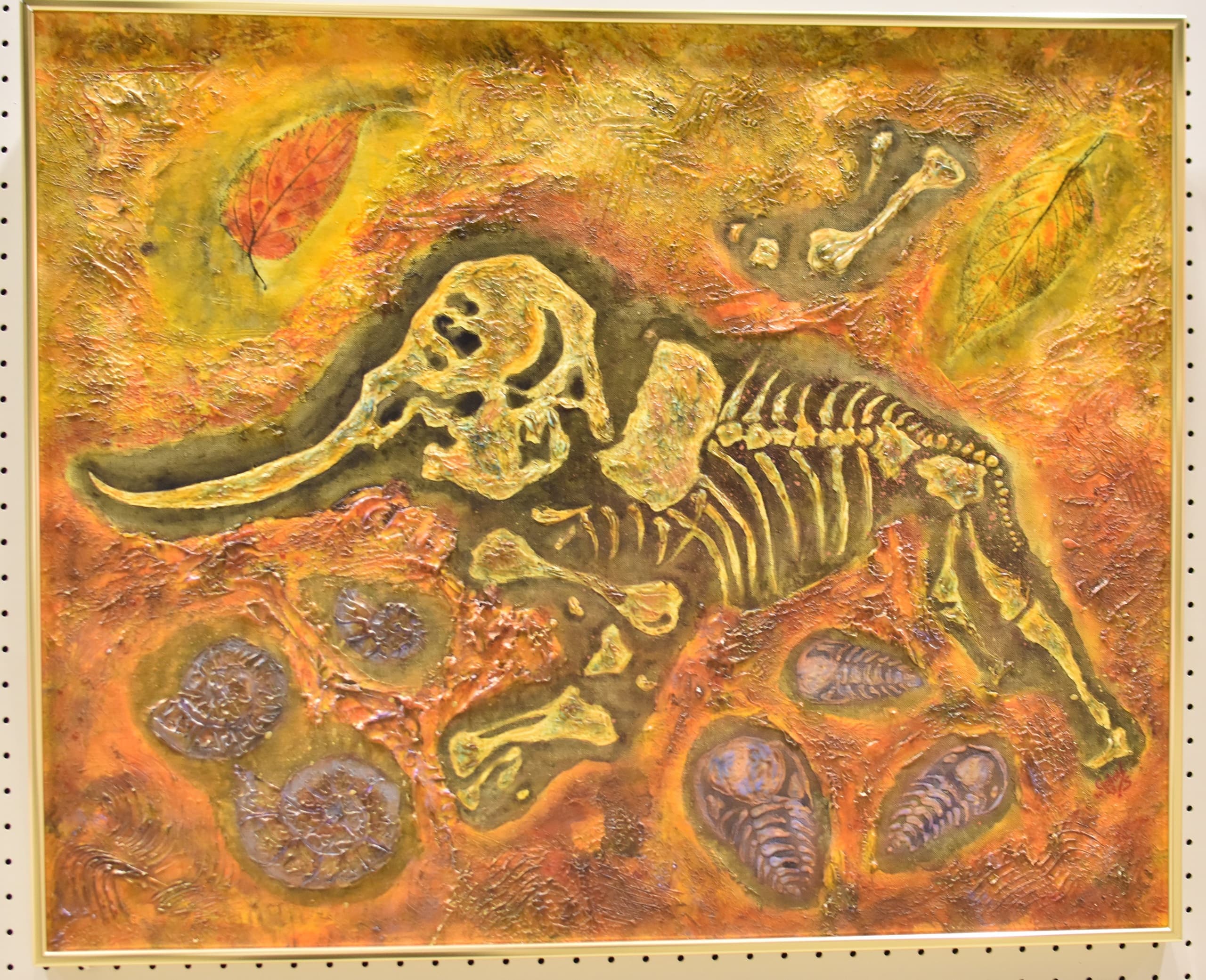 描く場所によってぬる道具を変えたり、質感を出すために塗り方を工夫したりしました。アケボノゾウを化石と肉体半分にしたので、アケボノゾウの歴史を感じていただければと思います。