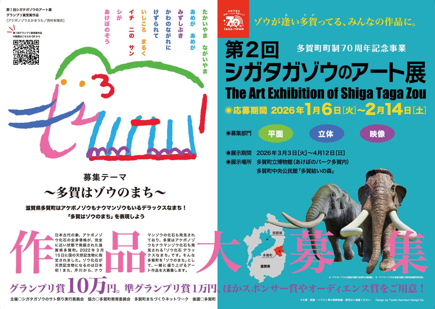 日本古来の象・アケボノゾウ化石が、完全に近い状態で発掘された滋賀県多賀町。2022年3月15日に国の天然記念物に指定されました。ゾウ化石が国の天然記念物になったのは日本初!皆様に知っていただこうとアケボノゾウ化石多賀標本をテーマに開催し、250点ものゾウ作品が集結して大好評を得た「第1回シガタガゾウのアート展」(2023年)に引き続き、「第2回シガタガゾウのアート展」を2026年春に開催することになりました!また皆様から様々なゾウ作品を募集しますので、今から作品製作の計画をお願いいたします。作品を作る方も、作品を観る方も、2026年春に多賀にお集まりください。どうぞお楽しみに!!