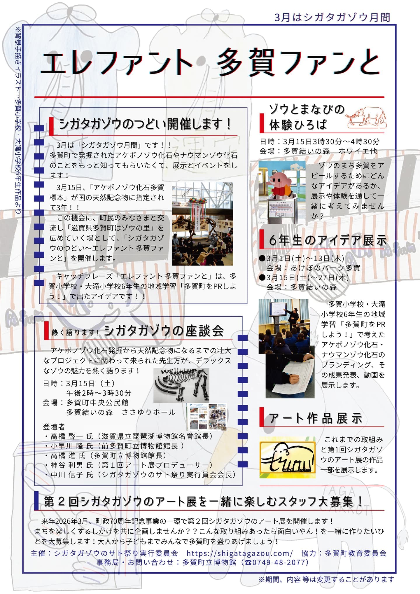 内容:アケボノゾウ化石発掘から、国の天然記念物になるまでの壮大なプロジェクトに関わって来られた先生方のお話が伺えます。そして、アケボノゾウとナウマンゾウがいる「デラックスなまち」の魅力を多くの人に共有する方法を多賀小学校、大滝小学校6年生の地域学習で考え取組んできたことを紹介します。また、町外に広く発信する手段として2023年に開催した「第1回シガタガゾウのアート展」から、全国ナウマンゾウサミットに参加したお話、そして、これからについて、ゾウを熱く語ります!