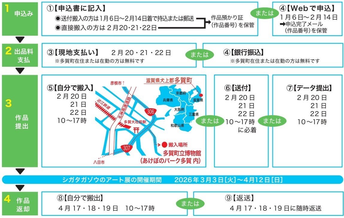 ⑧【自分で搬出】上記期間内に多賀町立博物館まで取りに来てください。本人確認のため「作品預かり証」または「作品番号」のご提示もお願いします。