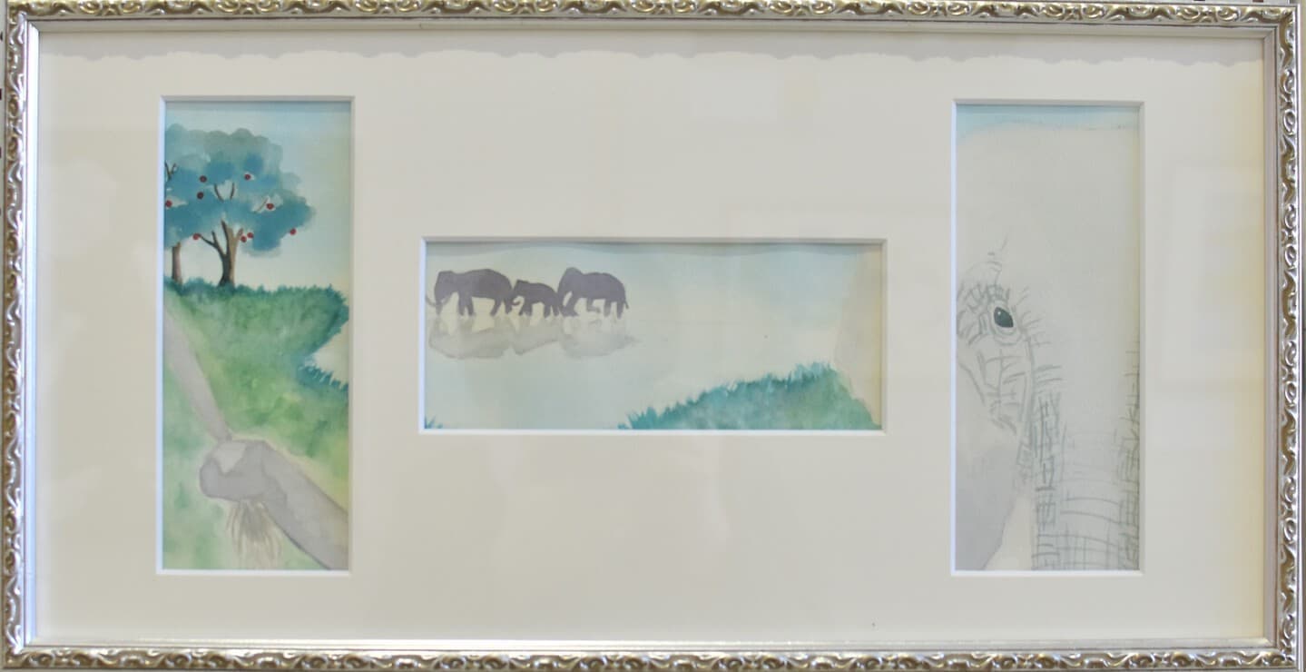 この作品は「もしも未来でアケボノゾウが生きていたらこんな風に暮らしていたらいいな」と思い想像しながら描きました。この作品で一番見て欲しい所は、子どものアケボノゾウが水を噴射しているところです。細かい水のところまで丁寧に描きました。未来でのアケボノゾウの想像の姿を想像しながら見てください。
